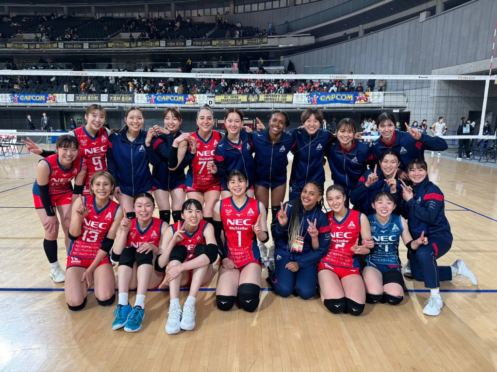 #77ジアのシャットアウトやスパイクで得点を重ねる。#2佐藤のサーブも走り、#15シッソのブロックも決まると6-0とリード。#1山田のブロードが連続で決まり、佐藤も緩急をつけて相手を揺さぶる。その後もレシーバーで入った#12佐々木がしっかりと守備を固め、佐藤のスパイクやシッソの高さあるスパイクで得点を重ね、相手に流れを渡すことなく25-15で1セット目を取り切った