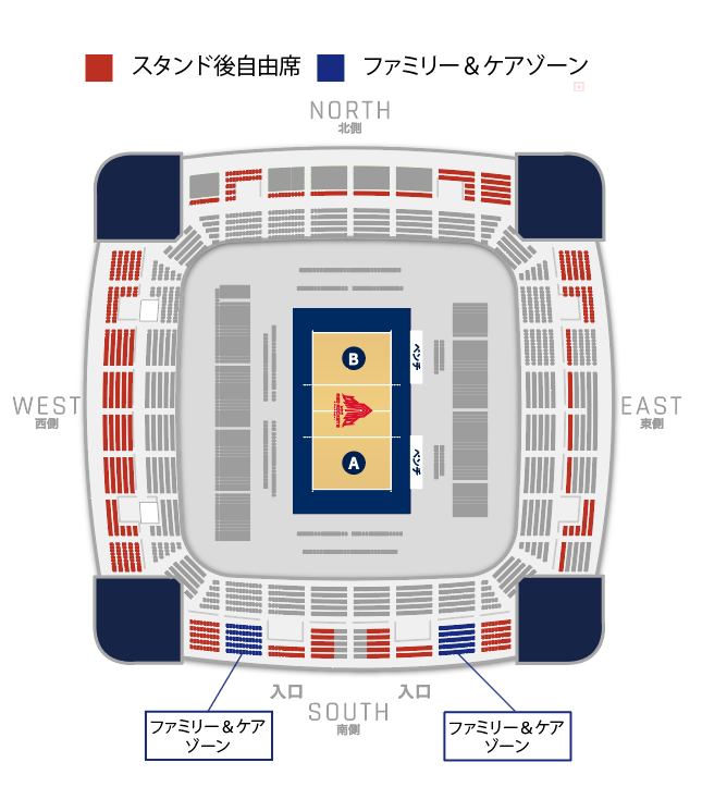 NECレッドロケッツ川崎では全てのお客様にとって快適な観戦環境の提供を目指し、試合中の席移動が発生しがちな小さなお子様をお連れの方や、歩行にご不安のある方向けの優先エリア「ファミリー&ケアゾーン」を試験導入いたします。