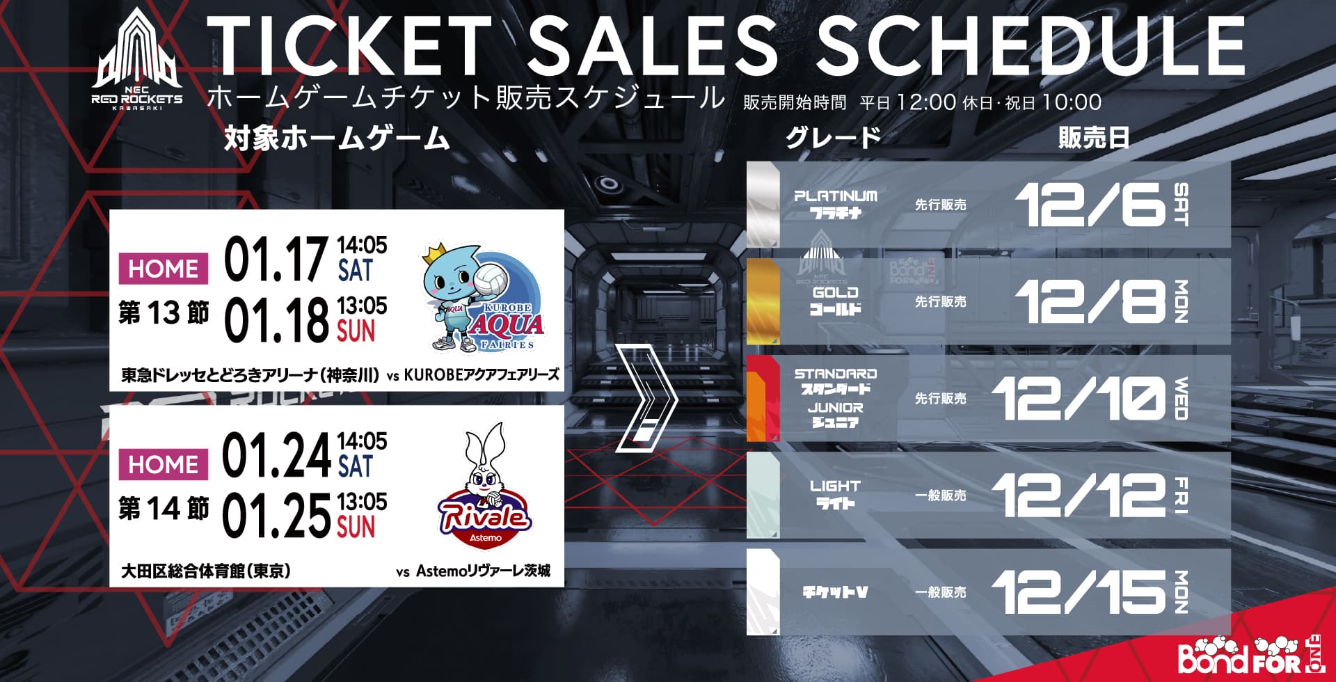 下記、試合日程のチケットは、12月6日(土) 10:00 PLATINUM MEMBERより順次販売開始いたします。
