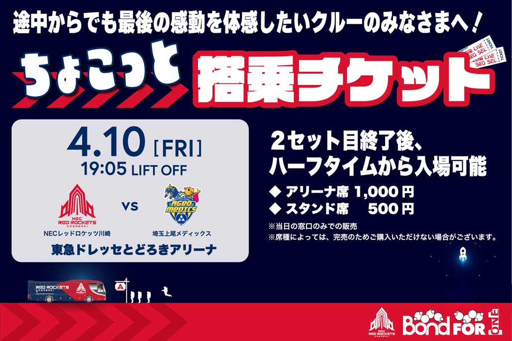 2026年4月10日(金) に開催されるクォーターファイナル 埼玉上尾メディックス戦にて、以前ご好評をいただきました、3セット目からご観戦できる「ちょこっと搭乗チケット」を販売いたします。